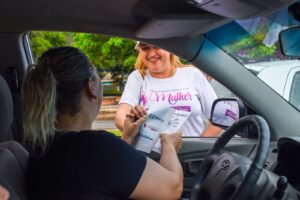 Ariane da Silva Ferreira, 26 anos, passava na hora da panfletagem e, vendo que a ação era de apoio à mulher, contou um pouco da história dela, que foi acolhida pela rede de proteção quando denunciou o marido por tentativa de homicídio.