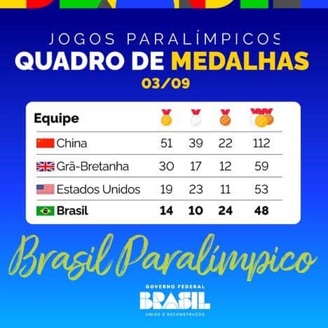 O dia ainda reservou outros três bronzes para o Brasil, dois na natação e um no tênis de mesa. O país soma agora 48 medalhas, com 14 ouros, 10 pratas e 24 bronzes, na quarta posição geral do quadro de medalhas dos Jogos Paralímpicos. Em todos os resultados, a digital do Bolsa Atleta do Governo Federal.