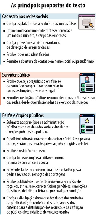 Entre as principais imposições do projeto — que serão aplicadas às redes sociais e aplicativos de mensagens com pelo menos 2 milhões de usuários — estão regras para coibir contas falsas e robôs (veja quadro abaixo). Os provedores terão ainda que limitar o número de contas vinculadas a um mesmo usuário.