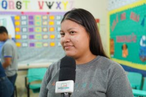 Essa é primeira vez que uma escola indígena participa do programa Parlamento Jovem, uma oportunidade para que essa população juvenil conheça todo o processo eleitoral, conforme destacou Khaislane Silva, aluna indígena de 17 anos que foi capacitada para atuar no programa.
