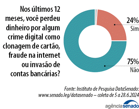 Os golpes digitais vitimaram 24% dos brasileiros com mais de 16 anos nos últimos 12 meses. São mais de 40,85 milhões de pessoas que perderam dinheiro em função de algum crime cibernético, como clonagem de cartão, fraude na internet ou invasão de contas bancárias. Os dados são de uma pesquisa divulgada nesta terça-feira (1º) pelo Instituto DataSenado.