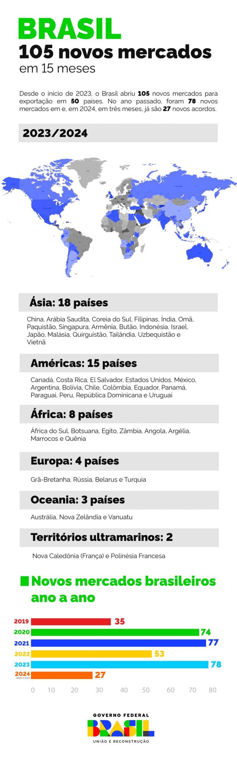 Abrir novos mercados no comércio internacional e ampliar os canais já existentes tem sido uma das metas do Governo Federal desde o início de 2023. Nos últimos 15 meses, o Brasil celebrou a abertura de 105 novos mercados, em 50 países, mais que o dobro do registrado no mesmo período da gestão anterior, quando 50 mercados foram abertos em 24 países.