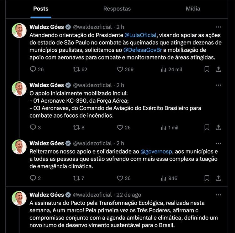 A ministra do Meio Ambiente e Mudança do Clima, Marina Silva, telefeonou na noite deste sábado ao governoador de São Paulo, Tarcísio de Freitas (Republicanos). Marina se solidarizou com a população do estado, que enfrenta ocorrência recorde de incêndios em mais de 30 municípios do interior. E ofereceu ajuda para reforçar o combate às chamas. No manhã deste domingo (25/8), o ministro da Integração e do Desenvolvimento Regional, Waldez Góes, anunciou o envio de três aeronaves das Forças Armadas, por determinação do presidente Luiz Inácio Lula das Silva.
