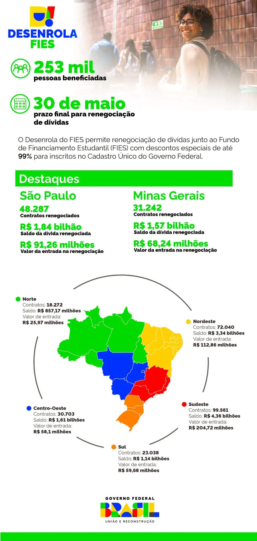 REGIÕES – O Sudeste foi a região com mais contratos fechados no Desenrola Fies. Somadas as negociações em São Paulo, Minas Gerais, Rio de Janeiro e Espírito Santo, foram fechados 99.561 contratos, que tinham um saldo de dívida de R$ 4,36 bilhões e que resultaram em R$ 204,72 milhões arrecadados com os valores de entrada.