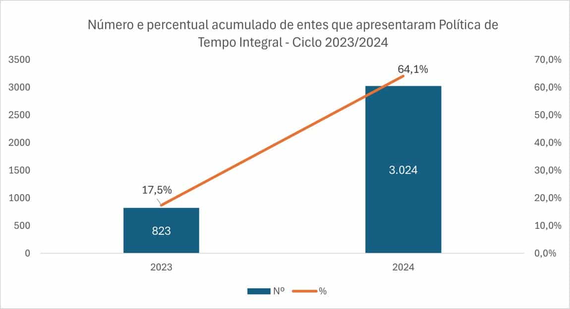 Desde a criação do Programa Escola em Tempo Integral , em 2023, pelo Ministério da Educação (MEC), dos 4.716 entes que pactuaram matrículas no âmbito da política , 3.024 (64,1%) apresentaram suas respectivas políticas locais de educação em tempo integral . O número representa um aumento de quase 50% no total de estados e municípios que possuem programas para o fomento dessa modalidade de ensino . locais para oferta de vagas em educação integral é um dos compromissos firmados entre as secretarias de educação participantes do programa e o MEC , como prevê a Portaria nº 1.495 / 2023 .