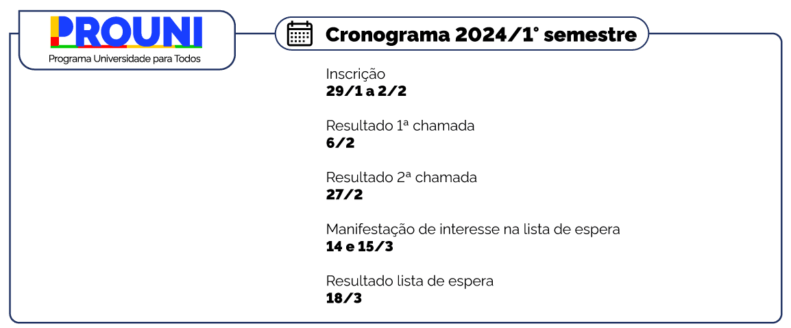 Resultado – O processo seletivo do primeiro Prouni de 2024 será constituído por duas chamadas sucessivas. Dessa forma, além da chamada realizada nesta terça-feira (6), uma segunda convocação será feita em dia 27 de fevereiro.