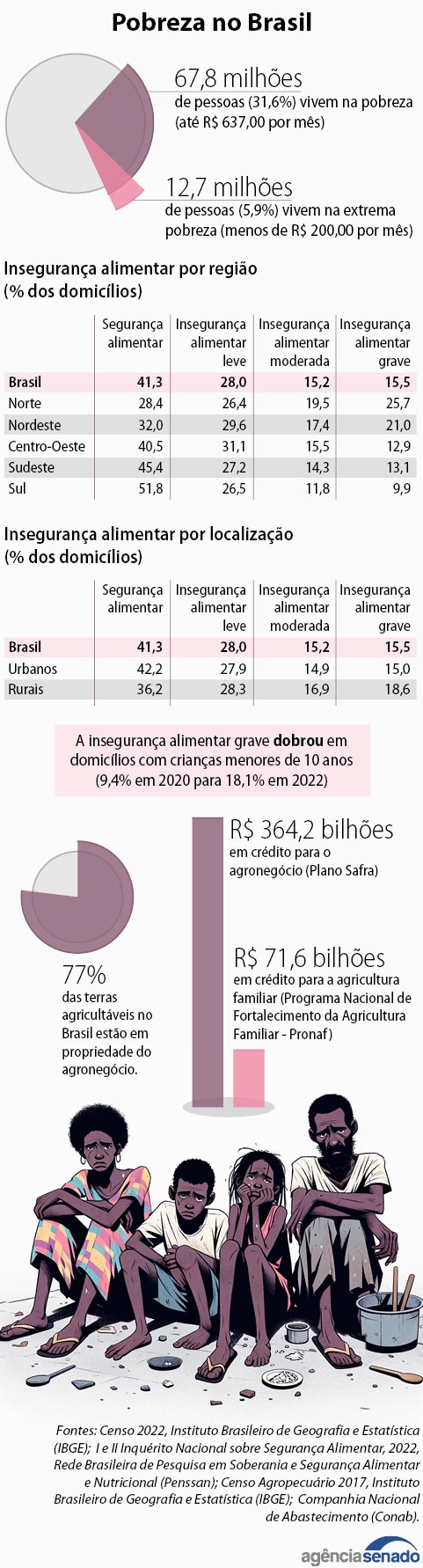 O presidente da CDH e propositor da audiência pública, senador Paulo Paim (PT-RS), alertou para o cenário de fome no Brasil. Para ele, é inadmissível que mais de 60 milhões de brasileiros vivam na pobreza, e cerca de 12 milhões na extrema pobreza, enquanto o país se coloca como o maior produtor e exportador de alimentos no mundo.