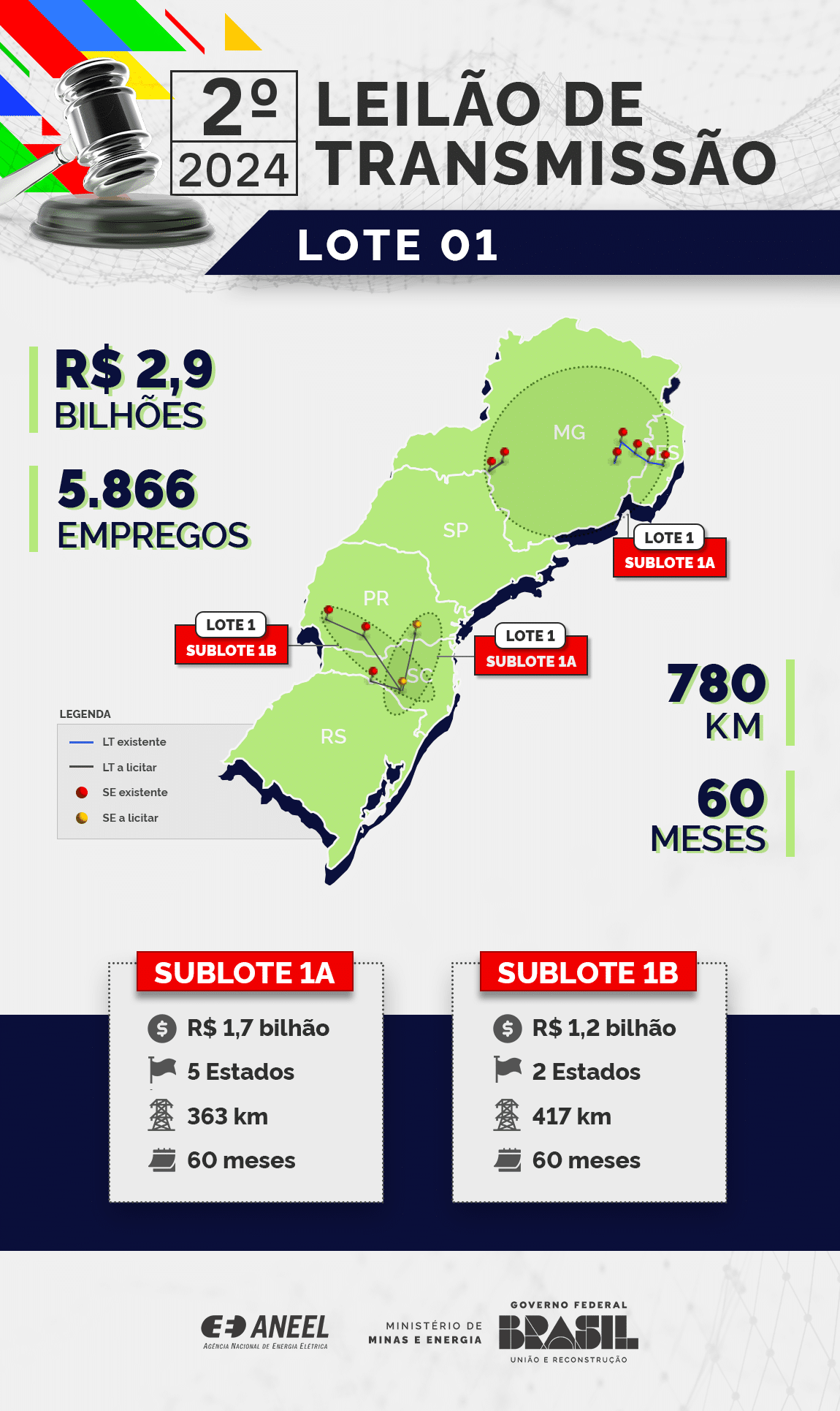 O lote 1, leiloado na sede da B3, em São Paulo, também prevê a expansão do sistema de transmissão da região do Triângulo Mineiro e Alto Paranaíba no estado de Minas Gerais. Esses empreendimentos visam atender o mercado consumidor e a previsão de expansão da micro e minigeração no sistema distribuidor da região. Neste lote, estão previstos 780 km de novas linhas de transmissão, passando por 43 municípios dos estados do Paraná, Santa Catarina, Minas Gerais, Espírito Santo e São Paulo.