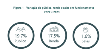 No entanto, apesar de não restabelecidos, os resultados do período pré-pandemia, o ano de 2023 apresenta números positivos, como o aumento de quase 20% no público e de 17,5% na renda. As salas faturaram R$ 2,2 bilhões com a venda de 114 milhões de ingressos em 2023. O parque exibidor encerrou 2023 com 3.468 salas abertas – variação positiva de 1,6% em relação a 2022, aproximando-se dos patamares de 2019 (3.507 salas).