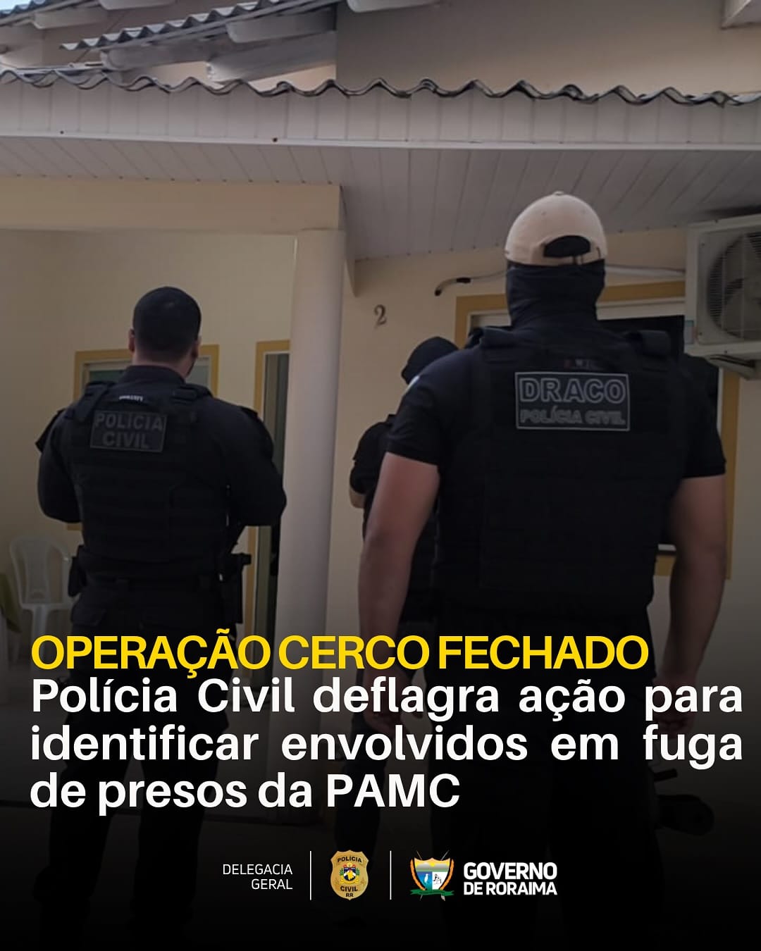 Nas primeiras horas da manhã desta quarta-feira, a PCRR (Polícia Civil de Roraima), por meio da DRACO (Delegacia de Repressão às Ações Criminosas Organizadas), deflagrou a Operação Cerco Fechado. A ação ocorre simultaneamente em Boa Vista, Cantá, Rorainópolis e no Amazonas, e tem como objetivo identificar e responsabilizar pessoas que teriam auxiliado na fuga de quatro detentos da PAMC (Penitenciária Agrícola de Monte Cristo).