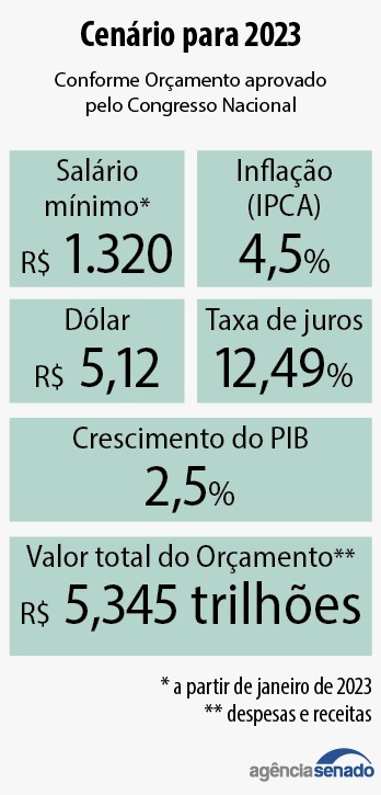 O valor total das receitas previsto para 2023 é de R$ 5,345 trilhões, dos quais R$ 2,010 trilhões são destinados ao pagamento dos juros e encargos da dívida pública federal e R$ 213,9 bilhões vão para investimentos. Dos cerca de R$ 3,191 trilhões restantes, 94% serão usados para pagar despesas obrigatórias.