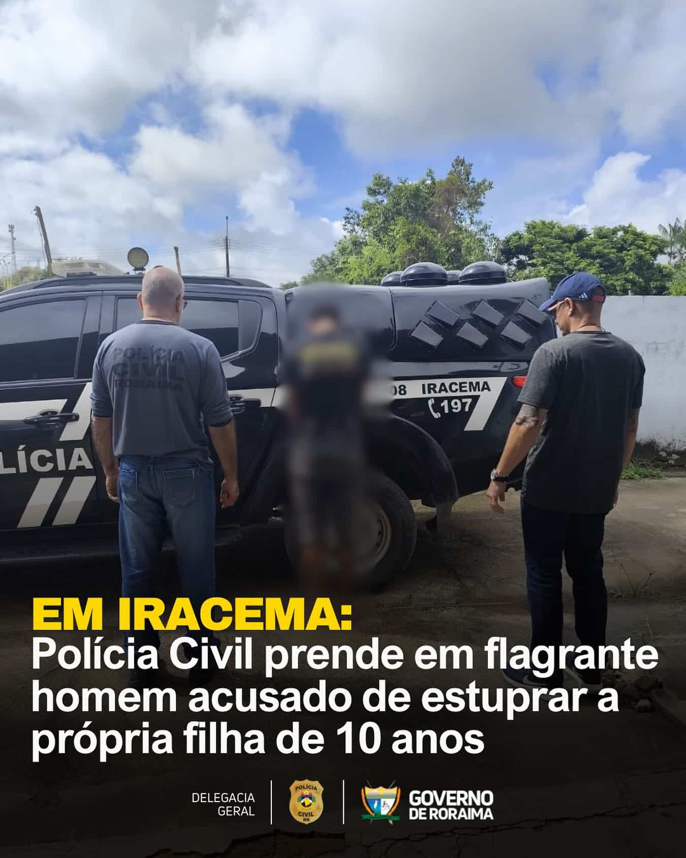 Diligências policiais realizadas pela PCRR (Polícia Civil de Roraima) por meio da Delegacia do município de Iracema resultaram, nesta segunda-feira, dia 11, na prisão em flagrante do diarista A.D.S.G., de 33 anos, por estuprar a própria filha de 10 anos. O homem foi localizado e preso na vila Poeirão, no município de Iracema.