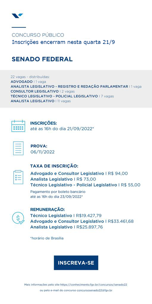 Termina nesta quarta-feira (21) o prazo de inscrição para o concurso do Senado Federal. São 22 vagas imediatas, além da formação de cadastro de reserva com 980 vagas. As provas objetivas serão aplicadas no dia 6 de novembro. As inscrições podem ser feitas pelo site da FGV, responsável pelo processo seletivo, e o pagamento da taxa precisa ser feito até sexta-feira (23).
