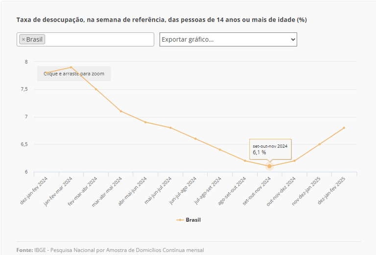 A taxa de desocupação repetiu seu valor mais baixo entre os trimestres encerrados em fevereiro (6,8%), que havia ocorrido em 2014, embora, se comparada com o trimestre anterior (setembro a novembro de 2024), tenha tido com alta de 0,7 ponto percentual.