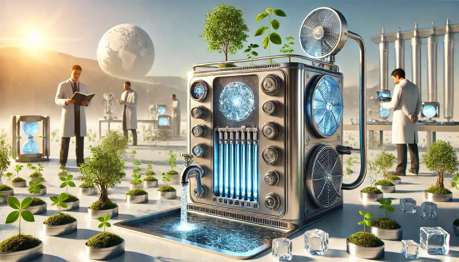 Um dispositivo futurista com design metálico elegante coleta umidade do ar e a converte em água potável, ajudando a combater a seca.