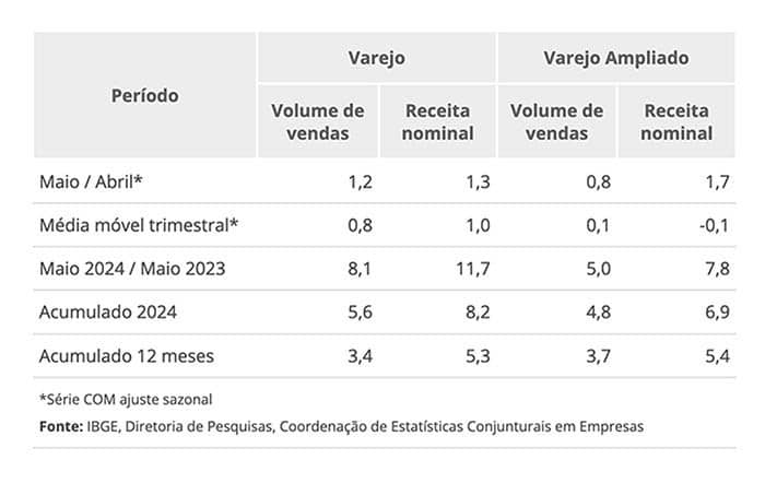 Na série sem ajuste sazonal, o comércio varejista subiu 8,1% em relação a maio de 2023, 12ª taxa consecutiva no campo positivo. O acumulado no ano chegou a 5,6% enquanto o acumulado nos últimos 12 meses ficou em 3,4%.